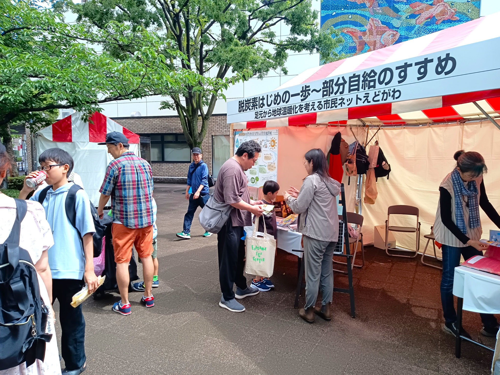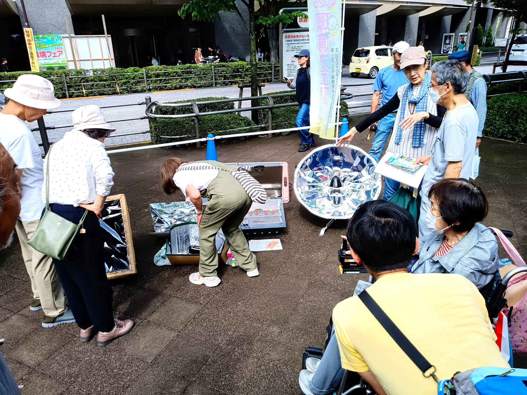 初めての会場で、駅前ということもあって、都議選候補者の演説やらユニセフの宣伝活動が続く中での出展でしたが、来場者にはソーラークッカーやソーラーフードドライヤーに関心を持っていただき、再生可能エネルギーや脱炭素について知っていただく良い機会になったと思います。