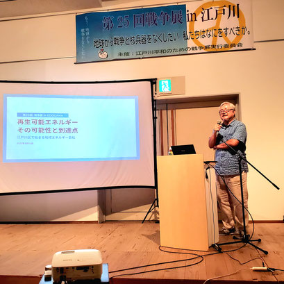 9月14~15日にタワーホール船堀で開催された「第25回戦争展 in EDOGAWA」に登壇しました。テーマは、「再生可能エネルギーの可能性と実現性」です。高騰する電気料金に対する再生可能エネルギーの安さや江戸川区が来春立ち上げる地域エネルギー会社についてお話しさせていただきました。